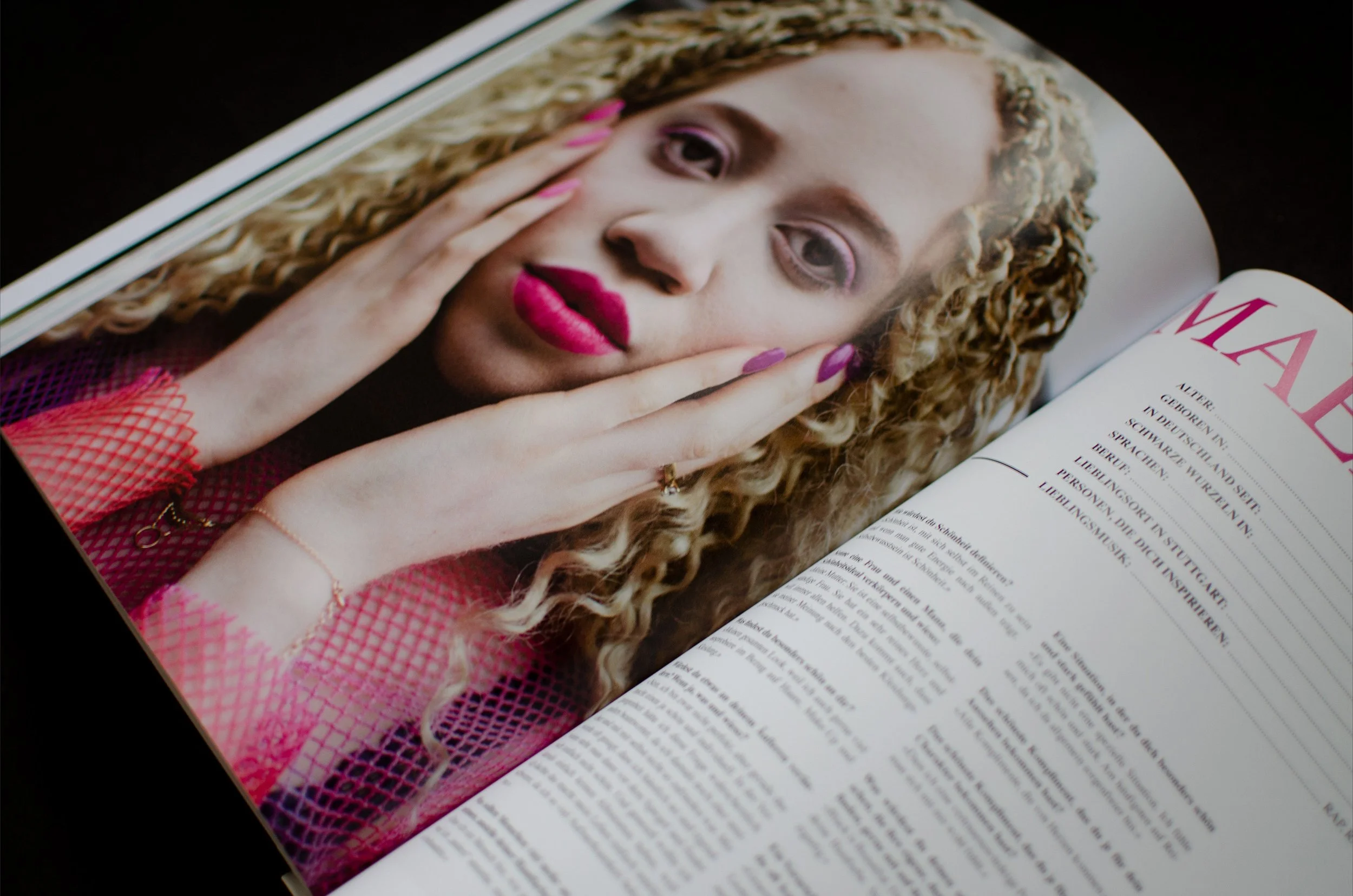Im März 2022 entwickelte ich aus den gesammelten Online-Beiträgen auf Instagram eine Sonderausgabe in gedruckter Form, die den Namen „Black is Beautiful – Stories“ erhielt. In dieser neuen, kompakteren Variante wurden auf 76 Seiten die neuen Gesichter der „Black is Beautiful“-Familie vorgestellt. Jeder der Teilnehmer:innen bekam außerdem, zusätzlich zu den Fragen über Schönheit und Vorurteile, die Möglichkeit, seine ganz persönliche Geschichte zu erzählen. Daher auch der Zusatz „Stories“ im Titel.
